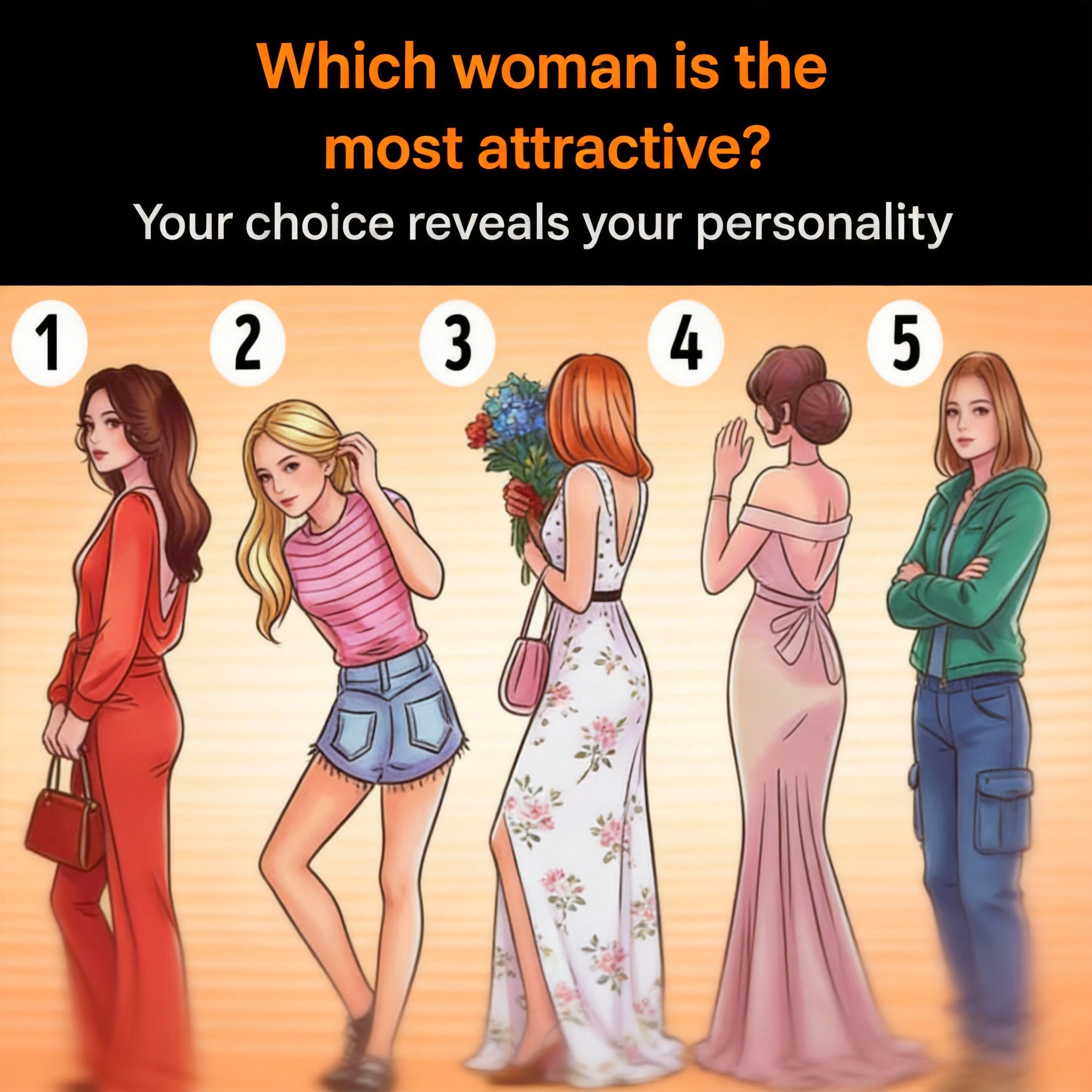 In one example, participants are asked to choose among five individuals and imagine which one they find most appealing if they turned around. Selecting Person No. 1 is often associated with a calm and balanced temperament. Individuals who identify with this choice are sometimes described as patient, resilient, and capable of facing challenges with determination. Difficult experiences may not discourage them but instead strengthen their ability to adapt and move forward.